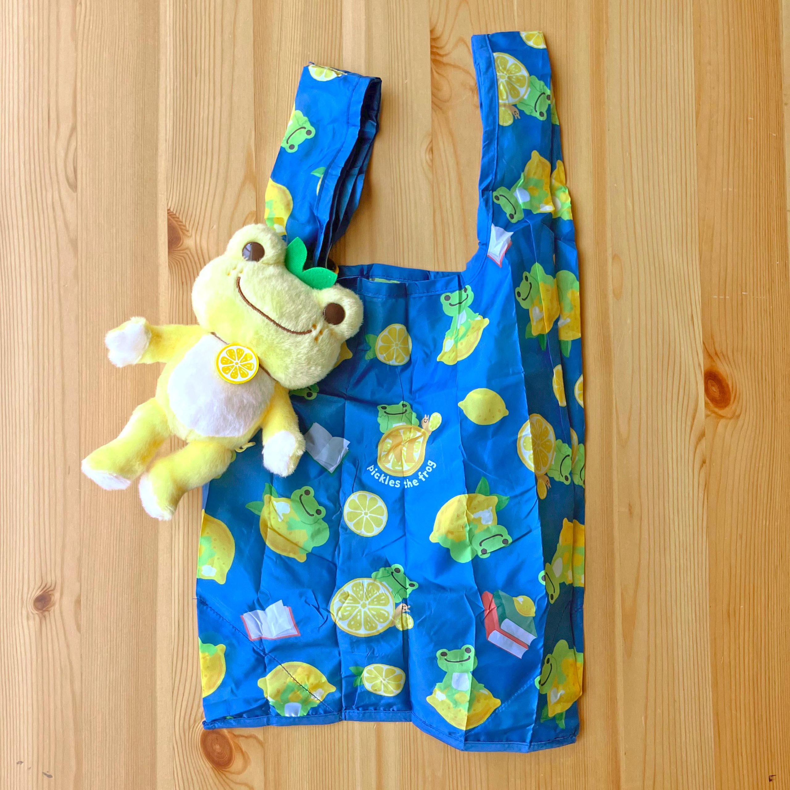 濃いブルー地にレモンとピクルスの総柄エコバッグが、れもん色のピクルスマスコットに収納されている、ぬいぐるみエコバッグが登場します🍋