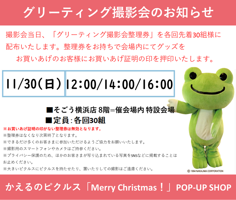 ※開店前に配付が終了していない場合は、8階=催会場内『かえるのピクルス「Merry Christmas!」POP-UP SHOP』会場内「整理券配付カウンター」にて「グリーティング撮影会 整理券」を配付いたします。グッズをお買いあげ後、レシートをご持参のうえ、「整理券配付カウンター」までお越しください。