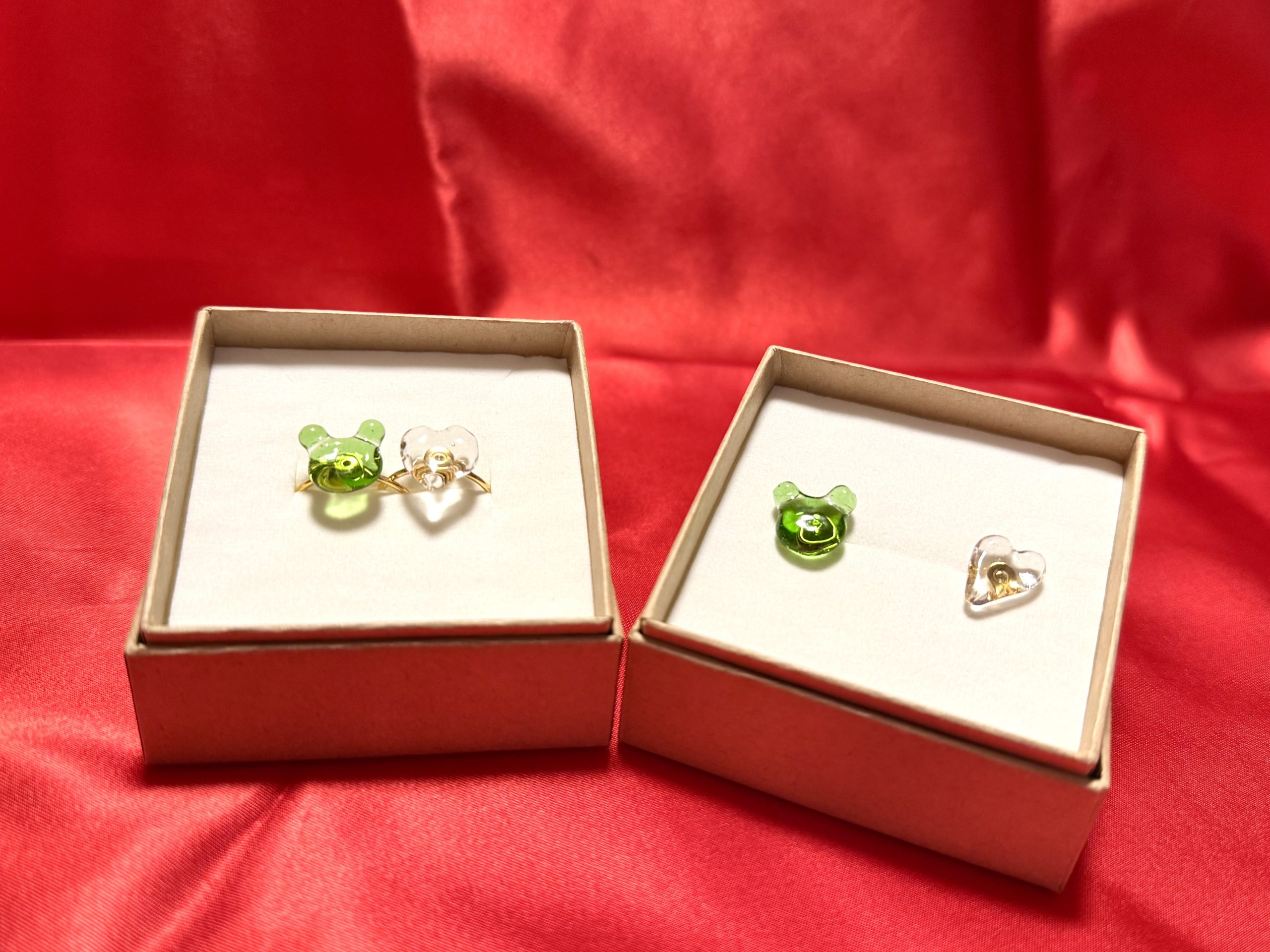 とろっとグリーンのピクルスフェイスとふわっと透明なハートとのセットで、リングとピアスに生まれ変わりました